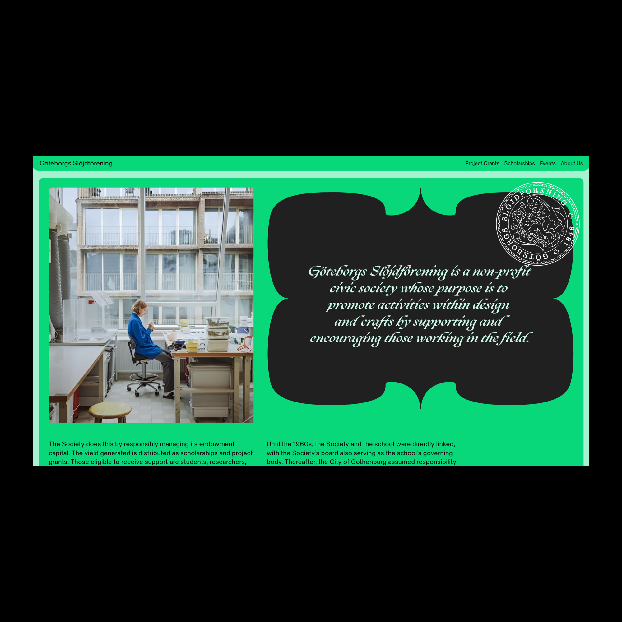 Göteborgs Slöjdförening is a non-profit civic society whose purpose is to promote design and craft activities by supporting and encouraging those working in the field.